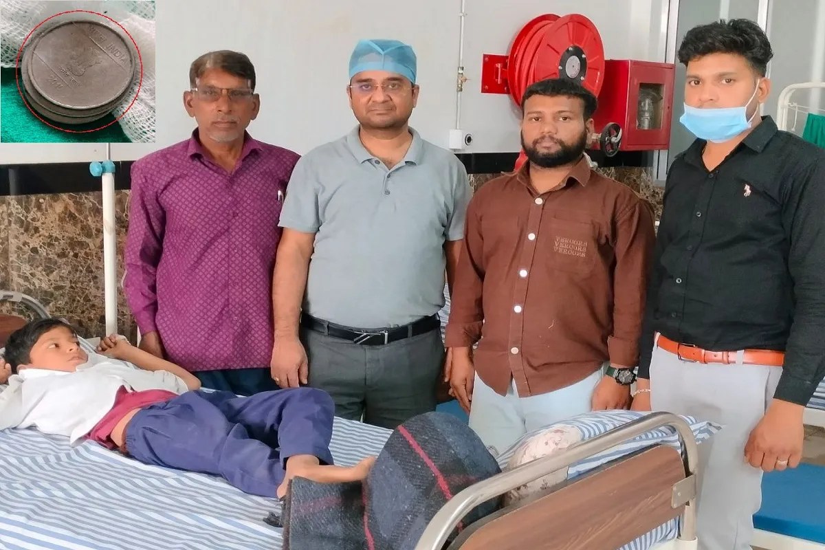 फुलेरा (जयपुर). खेल-खेल में एक छोटी सी लापरवाही ने 9 साल के पुनीत की जान पर बन आई। नरेना थाना क्षेत्र के भोगलिया का बास निवासी पुनीत ने अनजाने में तीन सिक्के मुंह में डाल लिए और निगल गए। सिक्के गले (एसोफैगस) में फंस गए, जिससे बच्चे को सांस लेने और निगलने में गंभीर परेशानी होने लगी। परिवार वाले घबराकर तुरंत नजदीकी अस्पताल पहुंचे, जहां स्थिति को देखते हुए ईएनटी विशेषज्ञ डॉ. सूर्यप्रकाश कुमावत को बुलाया गया। डॉ. कुमावत ने तत्काल एंडोस्कोपी प्रक्रिया शुरू की।