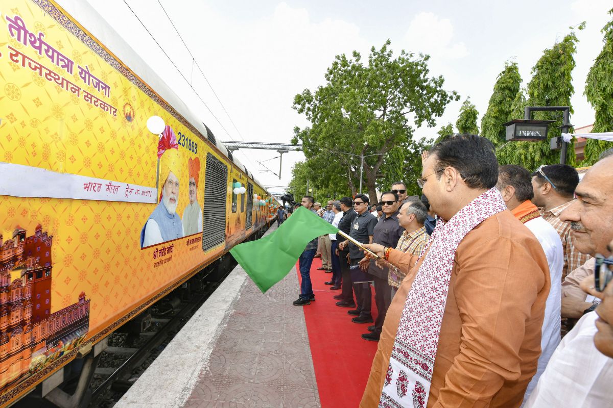 वरिष्ठ नागरिक तीर्थ यात्रियों की ट्रेन को हरी झंडी दिखाते सीएम (फोटो-पत्रिका)