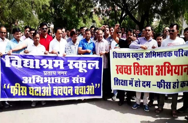 जयपुर। प्रदेशभर के स्कूलों में फीस वृद्धि का मामला तूल पकड़ता जा रहा है। रोज नए स्कूलों के नाम सामने आ रहे हैं। शनिवार को जयपुर के विद्याआश्रम स्कूल और सोफिया स्कूल के अभिभावकों ने फीस वृद्धि वापस करने के लिए आज दोनों ही स्कूलों में जोरदार प्रदर्शन किया। अभिभावक प्रदर्शन करते हुए सड़क पर आ गए।