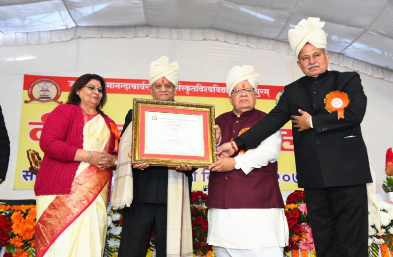 जयपुर। जगद्गुरु रामानंदाचार्य राजस्थान संस्कृत विश्वविद्यालय के तीसरे दीक्षांत समारोह में सोमवार को पत्रिका समूह के प्रधान संपादक डॉ. गुलाब कोठारी को डी.लिट की मानद उपाधि दी गई। राज्यपाल कलराज मिश्र ने उन्हें यह उपाधि मदाऊ स्थित विश्वविद्यालय परिसर में आयोजित दीक्षांत समारोह में प्रदान की। संस्कृत विश्वविद्यालय ने पहली बार वाचस्पति (डी.लिट) की मानद उपाधि दी। यह मानद उपाधि डॉ. कोठारी सहित 4 विशिष्ट विद्वानों को दी गई।