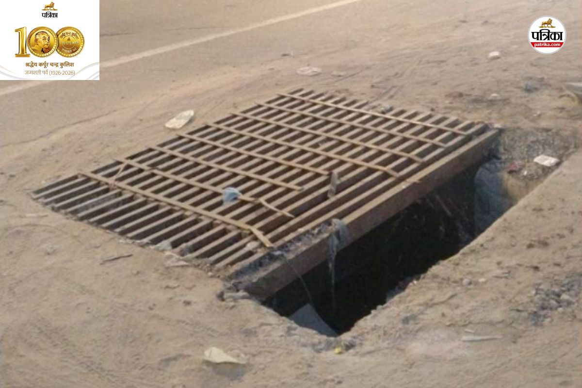 दिल्ली बाईपास रोड पर चुंगी नाका सर्कल के पास राजमार्ग पर नाले की पट्टी हटी है। इसमें पिछले दिनों एक बस का टायर फंस गया था। फोटो: पत्रिका