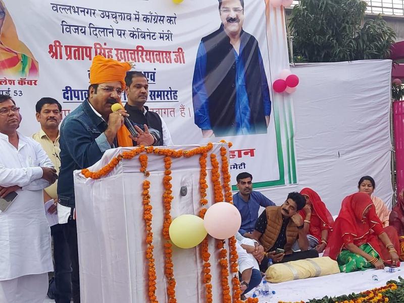 जयपुर। वल्लभनगर में कांग्रेस की ऐतिहासिक जीत पर आज परिवहन मंत्री प्रताप सिंह खाचरियावास का नागरिक अभिनंदन किया गया। कांग्रेस कार्यकर्ताओं ने वार्ड नंबर 52 के एक मैरिज गार्डन में खाचरियावास का ऐतिहासिक स्वागत किया गया। इस अवसर पर कार्यकर्ताओं का स्नेह मिलन और भोजन प्रसादी का कार्यक्रम भी रखा गया।कांग्रेस कार्यकर्ताओं को संबोधित करते हुए मंत्री प्रताप सिंह खाचरियावास ने कहा कि पूरे प्रदेश में कांग्रेस की गहलोत सरकार की जनकल्याणकारी और विकास की नीतियों की प्रशंसा हो रही है, यही कारण है कि मेवाड़ की धरती पर वल्लभनगर और धरियाबाद में वहां के मतदाताओं ने भाजपा के झूठ, फरेब और धोखे को हराकर कांग्रेस उम्मीदवारों को भारी मतों से जिताया। उन्होंने कहा कि पूरे जयपुर में और सिविल लाइंस विधानसभा क्षेत्र में वे स्वयं मोटरसाइकिल से दौरा कर सभी समस्याओं का समाधान करने की पहल करेंगे।