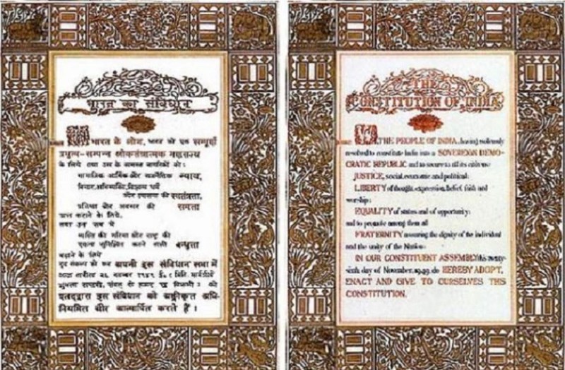 भारत के संविधान की मूल प्रति में 22 चित्र भारत के वैभवशाली इतिहास, परम्परा और संस्कृति को दर्शाते हुए लगे हैं। संविधान निर्माण में राजस्थान का योगदान भी अतुलनीय है। राजस्थान के प्रख्यात कलाकार कृपालसिंह शेखावत ने जहां नंदलाल बासु के साथ चित्रकारी में योगदान दिया।