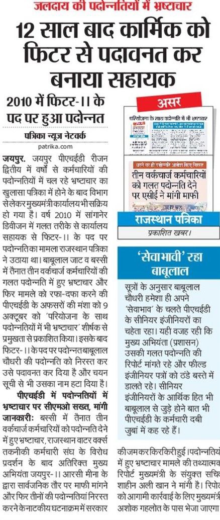 बाबूलाल जाट व बस्सी में तैनात तीन वर्कचार्ज कर्मचारियों की गलत पदोन्नति में हुए भ्रष्टाचार और फिर मामले को रफा-दफा करने की पीएचईडी के अफसरों की मंशा को 9 अक्टूबर को ’परियोजना के साथ पदोन्नतियों में भी भ्रष्टाचार’ शीर्षक से प्रमुखता से प्रकाशित किया। इसके बाद फिटर-।। के पद पर पदोन्नत बाबूलाल चौधरी की पदोन्नति को निरस्त कर उसे पदावनत कर दिया है और चयन सूची से भी उसका नाम हटा दिया है।