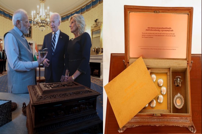 भारतीय संस्कृति की दिखती है झलक पीएम मोदी ने इस डिब्बे में बाइडेन को 10 चांदी के डिब्बे भी दिए हैं। इसके अलावा बॉक्स में दस दान राशियां हैं। गौदान (गाय का दान) के लिए गाय की जगह चांदी का नारियल है, भूदान (भूमि का दान) के लिए भूमि की जगह पर मैसूर कर्नाटक से लाया गया चंदन का सुगंधित टुकड़ा है। तिलदान (तिल के बीज का दान) के लिए तमिलनाडु से लाए गए तिल या सफेद तिल के बीज चढ़ाए गए हैं।