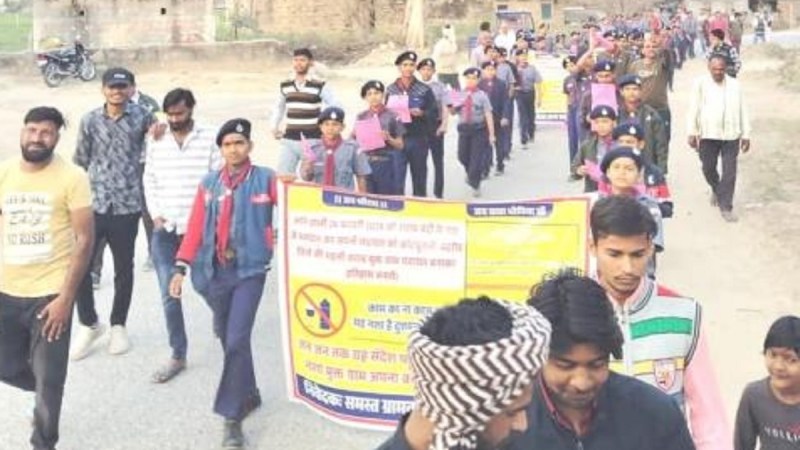 कांसली में प्रमुख मार्ग से गुजरती स्काउट छात्रों की रैली।