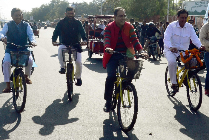 जयपुर। शहरवासियों को सााइकिल सुविधा देने के लिए स्मार्ट बायसाइकिल शेयरिंग प्रोजेक्ट गुरुवार से शुरू हुआ। नगरीय विकास मंत्री श्रीचंद कृपलानी ने गुरुवार को रामनिवास बाग के पास जेएलएन मार्ग पर इस प्रोजेक्ट का फीता काटकर शुभारंभ किया। इस दौरान मंत्री श्रीचंद कृपलानी ने साइकिल चलाई। कार्यक्रम में महापौर अशोक लाहोटी, स्मार्ट सिटी कंपनी के सीईओ रवि जैन भी आदि मौजूद थे।