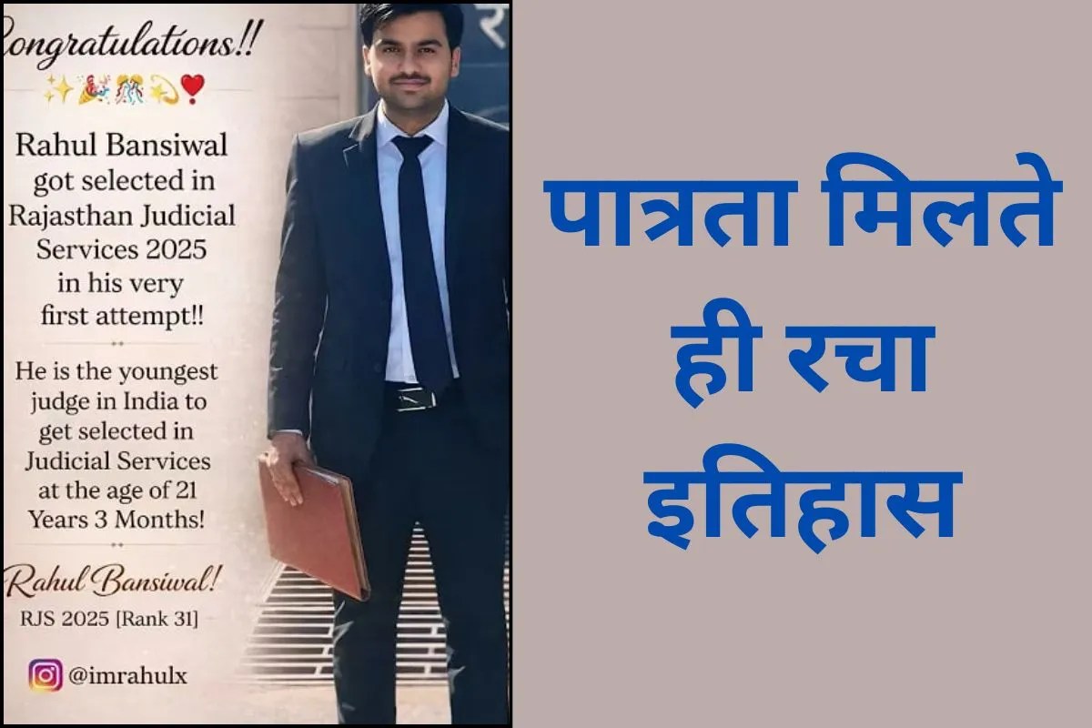 Rahul Bansiwal RJS: राजस्थान न्यायिक सेवा यानी आरजेएस परीक्षा.2025 के अंतिम परिणाम शुक्रवार को घोषित कर दिए गए। इन परिणामों में जहां एक ओर बेटियों का दबदबा रहा, वहीं दूसरी ओर एक ऐसा नाम उभरकर सामने आया जिसने उम्र की सीमाओं को पीछे छोड़ते हुए इतिहास रच दिया है। यह नाम है राहुल बंसीवाल, जिनका रोल नंबर रोल नंबर 44395 है। राहुल ने महज 21 साल 3 महीने की उम्र में सिविल जज बनकर प्रदेश को चौंका दिया है।