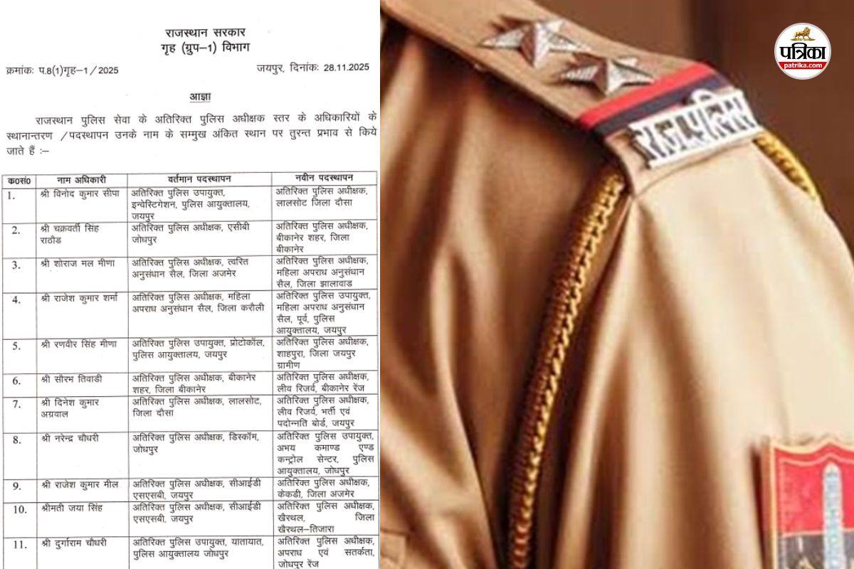देवेंद्र कुमार शर्मा को कमांडेंट 7वीं बटालियन आरएसी भरतपुर, प्रभुलाल धानिया को महिला अपराध अनुसंधान सेल बाड़मेर, भंवरलाल को त्वरित अनुसंधान सेल श्रीगंगानगर, कैलाश सिंह सान्दू को कमांडेंट पीएमडीएस बीकानेर, गोपाल सिंह भाटी को कमांडेंट आरपीटीसी जोधपुर तथा स्वाति शर्मा को एटीएस उदयपुर भेजा गया है। वहीं ज्ञानचंद को अपराध एवं सतर्कता भरतपुर रेंज और राजवीर सिंह चंपावत को अतिरिक्त पुलिस उपायुक्त इंटेलिजेंस एवं सुरक्षा प्रोटोकॉल, पुलिस आयुक्तालय जोधपुर लगाया गया है।