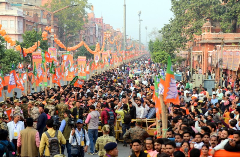 राजस्थान में सत्ता का संग्राम अब परवान पर पहुंच चुका है। पीएम मोदी मंगलवार को सांगानेरी गेट से करीब चार किलोमीटर का रोड शो करने वाले हैं। यहां पीएम मोदी को देखने के लिए बड़ी संख्या में लोग सुबह से ही पहुंचने शुरू हो गए हैं। मोदी के आने से पहले शहर में हर तरफ भगवा झंडे नजर आ रहे हैं। आसमान में गुब्बारे भी भगवा लगाए गए हैं। मोदी यहां रोड शो के बहुसंख्यक मतदाताओं पर फोकस करेंगे। इस दौरान मोदी का जगह-जगह स्वागत भी किया जाएगा।