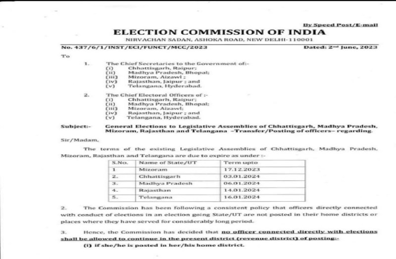 विधानसभा चुनाव से पहले आयोग ने 3 साल तक एक ही सीट पर रहने वाले अफसरों को हटाने का आदेश जारी किया है। इस आदेश का एक हिस्सा सोशल मीडिया पर वायरल हो रहा है। आदेश में मिजोरम, छत्तीसगढ़, मध्य प्रदेश, राजस्थान और तेलंगाना राज्यों का उल्लेख करते हुए आगे एक तारीख का अंकन किया गया है। जिसे लोग चुनाव की तारीख बता रहे हैं, जबकि असलियत में इन पांचों राज्यों में वर्तमान विधानसभा के कार्यकाल खत्म होने की तारीख है। राजस्थान में 14 जनवरी, 2024 को वर्तमान विधानसभा का कार्यकाल खत्म हो जाएगा।