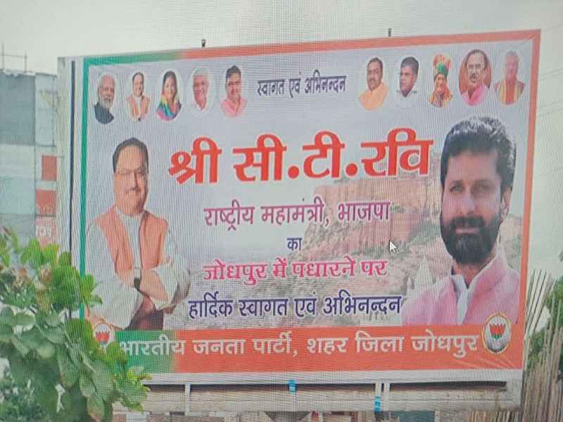 मगर इन सबके बीच भाजपा के राष्ट्रीय महामंत्री सी.टी. रवि तीन दिवसीय प्रवार पर सोमवार को आ रहे हैं। रवि 19 को जोधपुर, 20 को अजमेर और 21 जुलाई को जयपुर प्रवास पर रहेंगे। इस दौरान विभिन्न संगठनात्मक बैठकों में भाग लेंगे। मगर जोधपुर में उनके दौरे से पहले ही खेमेबाजी नजर आई है। यहां उनके स्वागत के लिए लगे पोस्टर्स में पूर्व मुख्यमंत्री वसुंधरा राजे की एंट्री हो गई है और प्रदेशाध्यक्ष सतीश पूनियां को होर्डिंग-पोस्टर से आउट कर दिया गया है।
