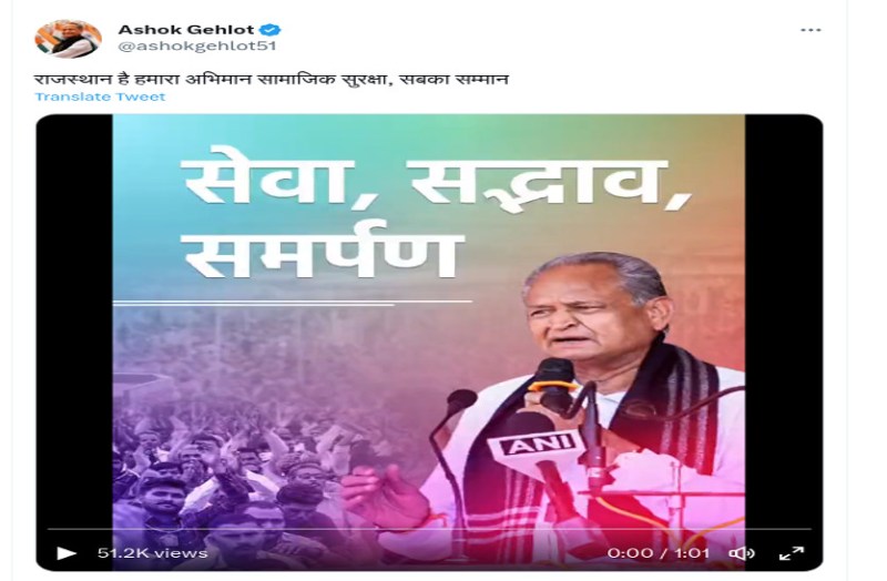 जयपुर। मुख्यमंत्री अशोक गहलोत ने अपने ट्विटर हैंडल पर एक वीडियो शेयर किया और कैप्शन दिया, 'राजस्थान है हमारा अभिमान सामाजिक सुरक्षा, सबका सम्मान'। वीडियो में सेवा सद्भाव और समर्पण की थीम दिखाई गई। इस वीडियो को सोशल मीडिया पर कई बार रीट्वीट किया गया। इस पर लोगों ने जमकर कमेंट भी किए। कुछ यूज़र्स ने लिखा, 'राजस्थान है हमारा अभिमान सामाजिक सुरक्षा, सबका सम्मान, इसलिए गहलोत जरूरी है। वहीं कुछ ने 'जय हो जननायक सरकार जय जय राजस्थान' लिखा। इतना ही उनके समर्थन में Great leader of Rajasthan तक ट्वीट किया गया।