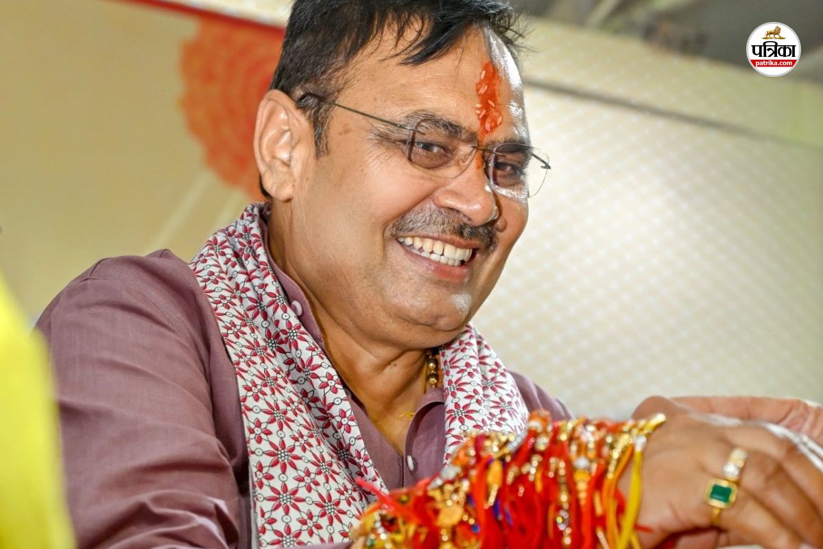 राखी बंधवाने के बाद खुश नजर आते राजस्थान के सीएम भजनलाल। फोटो पत्रिका