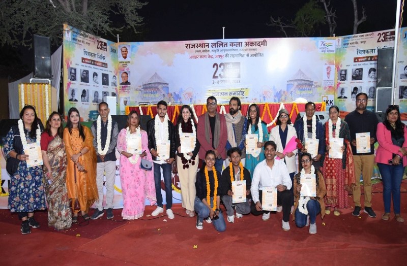 जयपुर। राजस्थान ललित कला अकादमी की ओर से और जेकेके की सहभागिता में आयोजित किए जा रहे 23वें कला मेले का बुधवार को समापन हुआ। बीस सूत्री कार्यक्रम के उपाध्यक्ष डॉ.चंद्रभान समापन समारोह के मुख्य अतिथि थे। इस अवसर पर कला के क्षेत्र में उल्लेखनीय कार्य के लिए दिव्यांग चित्रकार बजरंग लाल सुथार को लाइफटाइम अचीवमेंट अवॉर्ड दिया गया। साथ ही विभिन्न पैमानों के आधार पर मेले के प्रतिभागी कलाकारों में से चयनित किए गए 15 कलाकारों को सम्मानित किया गया। इन कलाकारों में त्रिलोक चंद जांगिड़, उषा पुरोहित, नीरजा शेखावत, इकबाल हुसैन, भारती आर्य, ओजस्वी अग्रवाल, विनीता कसाना, निकिता, नैना सोमानी, मानवेन्द्र सिंह, एकता शर्मा, शिवपाल कुमावत, प्रवीण कुमार, वाणाश्री राजू दाबीर और स्नेहा शामिल हैं। साथ ही पोस्टर प्रतियोगिता के विजेताओं को भी सम्मानित किया गया। इस अवसर पर वरिष्ठ कलाकार चिन्मय एस मेहता भी उपस्थित थे।