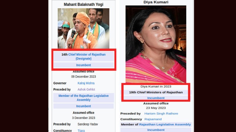सांसद से विधायक बने योगी बालक नाथ और दिया कुमारी को 'विकिपीडिया' राजस्थान का मुख्यमंत्री दर्शा रहा है। इन दोनों नव निर्वाचित विधायकों के प्रोफ़ाइल पेज पर इन्हें मुख्यमंत्री का दर्जा दे दिया गया है, जो हैरान करने जैसा है। बालक नाथ को जहां प्रदेश का 14 वां मुख्यमंत्री बताया जा रहा है तो वहीं दिया कुमारी को 19 वां मुख्यमंत्री होने का ज़िक्र है।