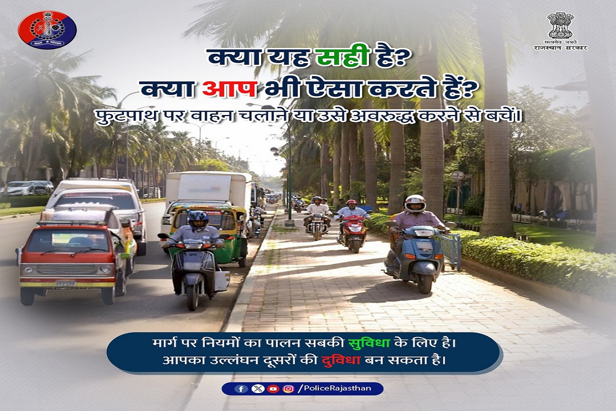 राजस्थान पुलिस ने सभी वाहन चालकों से अनुरोध किया है कि वे यातायात नियमों का पालन करें और फुटपाथ को केवल पैदल यात्रियों के लिए सुरक्षित रखें।