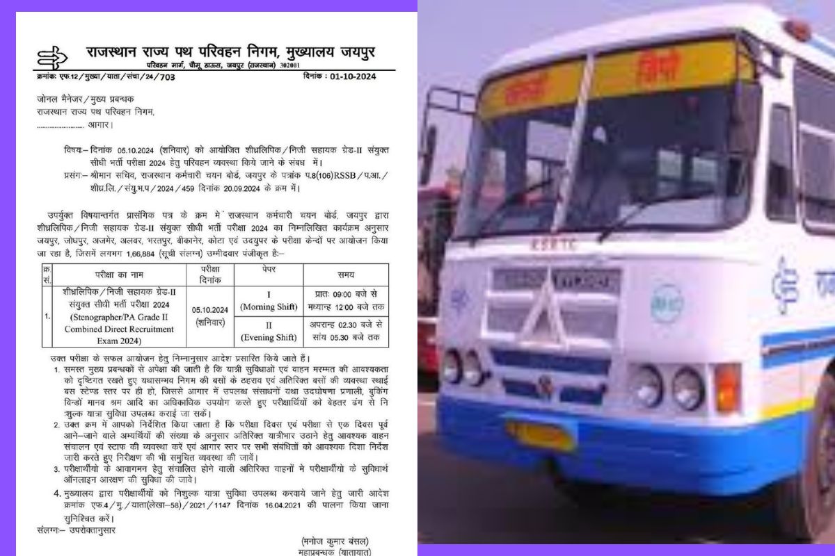राजस्थान कर्मचारी चयन बोर्ड की ओर से अक्टूबर माह में अलग-अलग तारीखों पर कुल चार दिन तक प्रतियोगी परीक्षाओं का आयोजन किया जा रहा है। इस कारण राजस्थान राज्य पथ परिवहन निगम ने परीक्षा देने वाले परीक्षार्थियों को यह सुविधा उपलब्ध कराई है। सबसे पहले 5 अक्टूबर को शीघ्रलिपिक की परीक्षा हो रही है। जिसमें लगभग 1,66,884 परीक्षार्थी भाग लेंगे। इसके बाद आगामी 22, 23 व 24 अक्टूबर को लगातार समान पात्रता परीक्षा (सीईटी) सीनियर सैकण्डरी स्तर का आयोजन होगा। इसमें 18 लाख 63 हजार 82 अभ्यर्थियों ने आवेदन किया है।