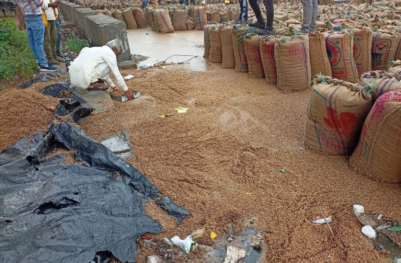 कृषि उपज मंडी में छोटा पुराना नाला टूटा हुआ होने तथा कचरे से अटा होने के कारण नीलामी स्थल पर पानी का भराव हो गया। करीब एक से डेढ़ फुट पानी का भराव हो जाने से हजारो गेहूं, सरसो व धनिए के कटटे व बोरिया पानी में भीग गए। वही एक किसान का करीब 40 बोरी धनियां पानी में बह गया। जिसे वह पानी से निकाल कर बचाने का जतन करता नजर आया।