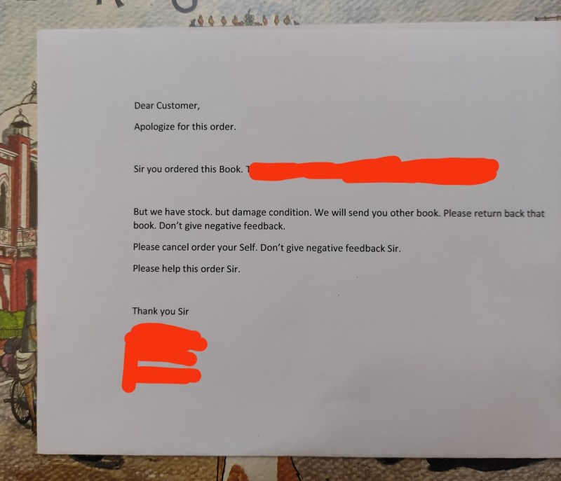 ट्विटर पर कशिश नाम के एक शख्स ने खुलासा किया कि उसने अमेजन से एक किताब मंगवाई थी, लेकिन उसने जो किताब चुनी थी, उसके बदले उसे बच्चों की किताब 'लुकिंग फॉर लड्डू' मिली थी। पैकेट खोलने के बाद उसे सेलर का एक नोट भी मिला। नोट में कशिश से माफी मांगी गई और कहा कि हालांकि सेलर के पास वह किताब थी जिसका कशिश ने ऑर्डर किया था, लेकिन वे उसे नहीं भेज सके क्योंकि यह फटी हुई थी। नोट में आगे कहा गया है कि वह इस आॅर्डर को रिटर्न कर दें लेकिन प्लीज नेगेटिव रिव्यू न दें।'