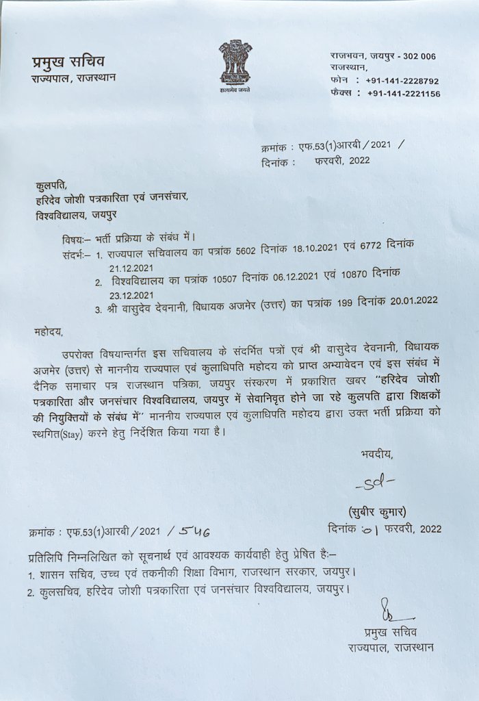 हरिदेव जोशी पत्रकारिता विवि की भर्ती प्रक्रिया को स्थगित कर दिया गया है। राज्यपाल कलराज मिश्र ने इस भर्ती प्रक्रिया पर रोक लगा दी है। दरअसल विवि की भर्ती प्रक्रिया को लेकर लगातार सवाल उठ रहे थे। पूर्व शिक्षामंत्री वासुदेव देवनानी ने इस संबंध में राज्यपाल को पत्र लिखा था। सेवानिवृत्त होने जा रहे कुलपति ओम थानवी द्वारा की जा रही शिक्षक नियुक्ति पर सवाल उठ रहे थे। राज्यपाल के प्रमुख सचिव सुबीर कुमार ने इस संबंध में आदेश जारी किए हैं।