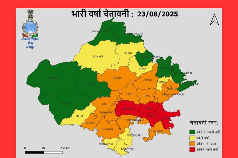 -आज 23 अगस्त को कोटा संभाग व आसपास के जिलों में कहीं-कहीं अत्यंत भारी बारिश, जयपुर, अजमेर, उदयपुर संभाग में कहीं-कहीं अति भारी बारिश व शेष भागों में मध्यम से तेज बारिश होने की प्रबल संभावना है।