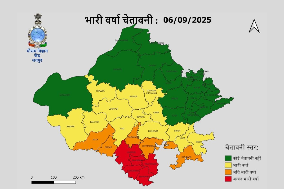 मौसम विभाग के अनुसार राजस्थान के बांसवाड़ा, डूंगरपुर, प्रतापगढ़, सलूम्बर व उदयपुर जिलों में छह सितम्बर को अत्यंत भारी बारिश की संभावना है। मौसम विभाग ने इसे रेड अलर्ट की श्रेणी में रखा है।