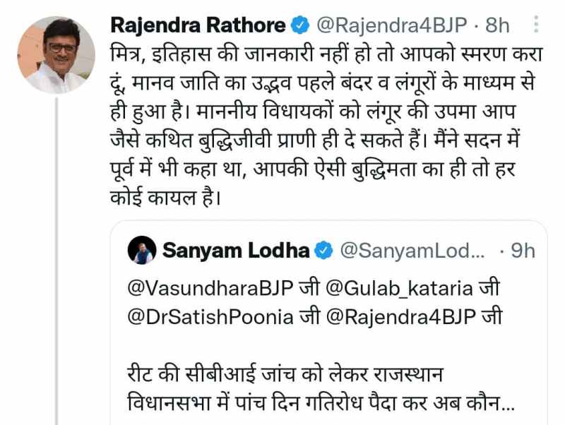लोढ़ा ने लिखा कि रीट की सीबीआई जांच को लेकर राजस्थान विधानसभा में पांच दिन गतिरोध पैदा कर अब कौनसा कम्बल ओढ़कर सो गए। सदन मे लंगूरों की आवाज निकालकर हंगामा करने से गरिमा तार-तार ही हुई है। इस पर राठौड़ ने लिखा कि मित्र, इतिहास की जानकारी नहीं हो तो आपको स्मरण करा दूं। मानव जाति का उद्भव पहले बंदर व लंगूरों के माध्यम से ही हुआ है। विधायकों को लंगूर की उपमा आप जैसे कथित बुद्धिजीवी प्राणी ही दे सकते हैं। मैंने सदन में पूर्व में भी कहा था, आपकी ऐसी बुद्धिमता का ही तो हर कोई कायल है। आपको बता दें कि कुछ दिन पहले भी दोनों नेताओं के बीच सोशल मीडिया पर तकरार हुई थी। भाजपा लगातार इस मुद्दे को उठा रही है। सदन और सड़क दोनों ही जगहों पर भाजपा लगातार सरकार पर सीबीआई जांच कराने का दबाव बना रही है।