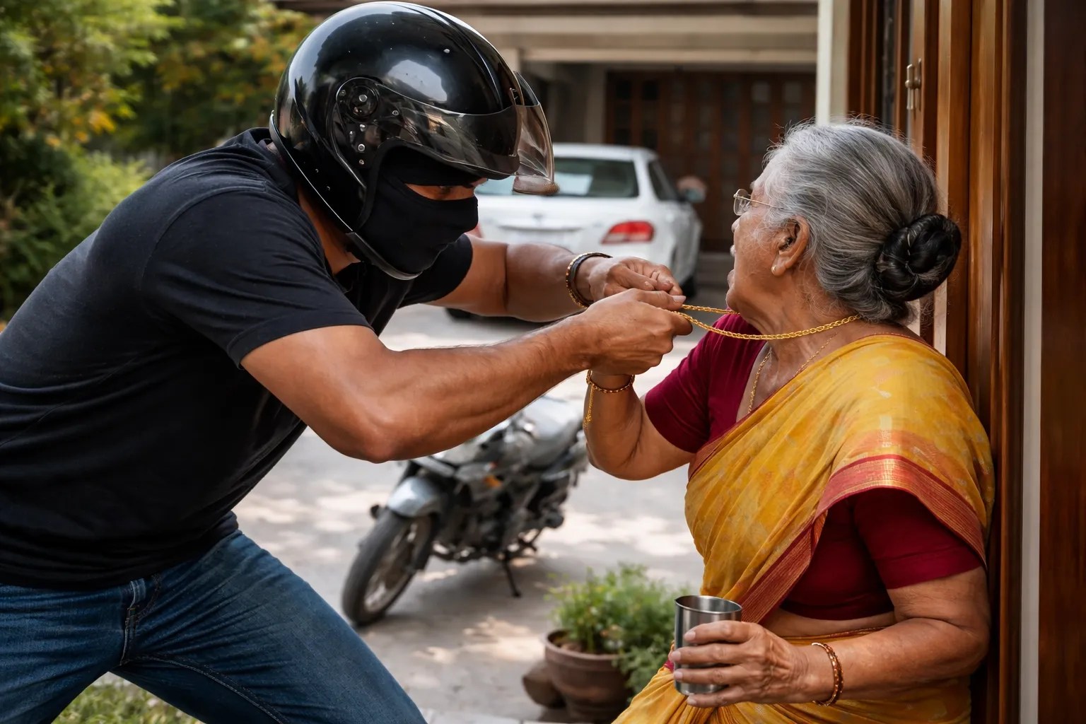 बुजुर्ग महिला के गले से चेन तोड़ ले गया (फोटो-एआई)