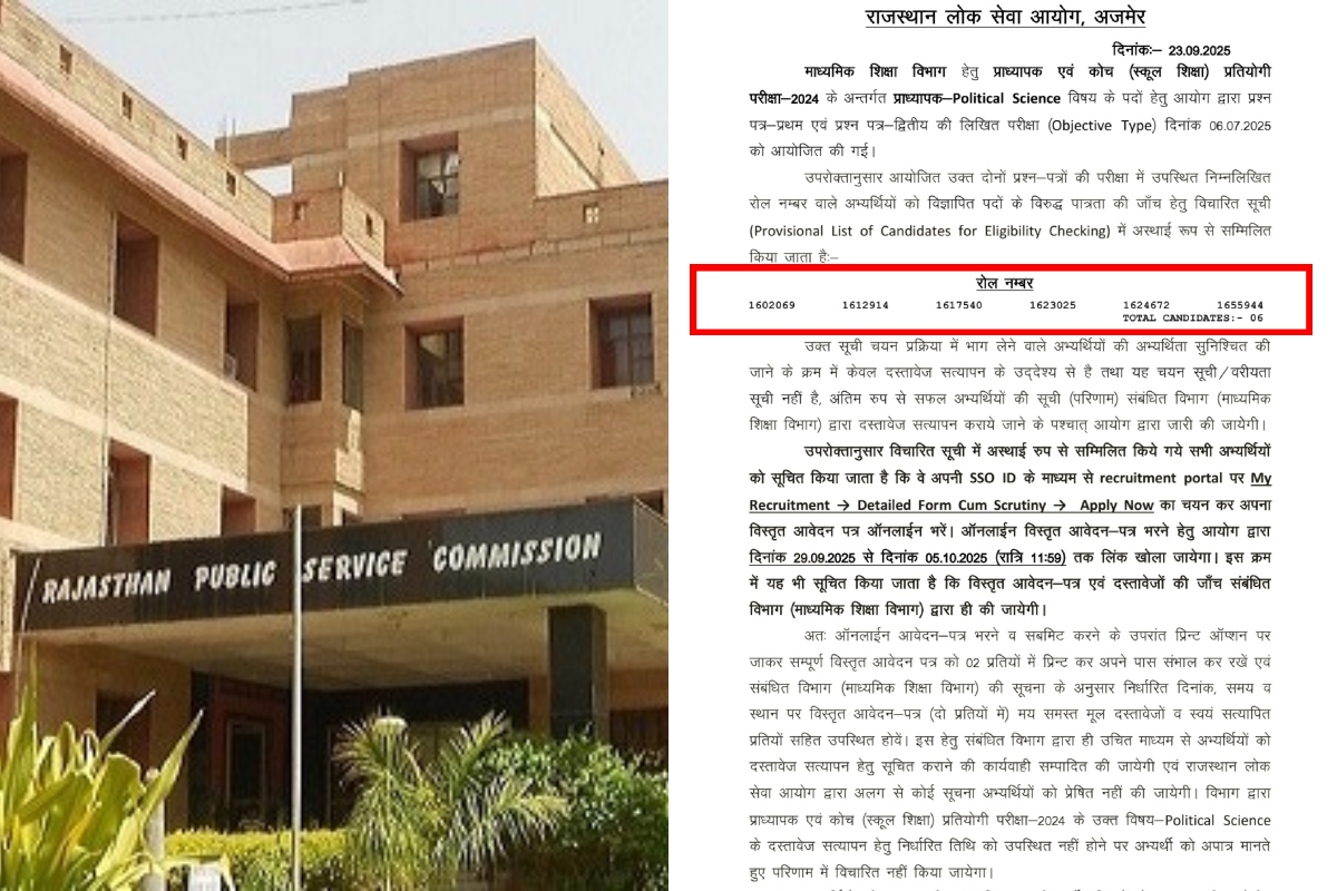 Rajasthan News: राजस्थान लोक सेवा आयोग (RPSC) ने स्कूल लेक्चरर भर्ती परीक्षा 2025 के परिणामों के बाद पूरे प्रदेश में हलचल मची हुई है। विशेष रूप से राजनीतिक विज्ञान विषय के नतीजों ने सभी को चौंका दिया है। राजनीतिक विज्ञान विषय के 225 पदों के लिए केवल 6 अभ्यर्थी ही पास हो पाए। इस परिणाम के बाद अभ्यर्थियों में भारी रोष देखा जा रहा है।