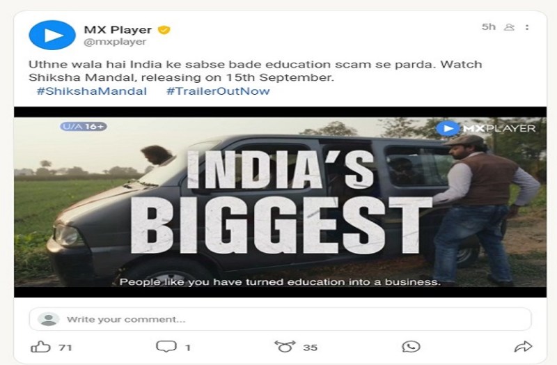 किसी भी विद्यार्थी का सपना स्कूल खत्म करना और सुरक्षित भविष्य बनाने के लिए अच्छी उच्च शिक्षा प्राप्त करना, लेकिन देश के हर कोने से आए दिन शिक्षा प्रणाली में घोटाले के मामले सामने आ रहे हैं। एजुकेशन सिस्टम में घोटालों की पोल खोलती ऐसी ही एक वेब सीरीज आ रही है ’शिक्षा मंडल’। एक के बाद एक कई सबक देने वाली कहानियों का तोहफा दर्शकों को देने के बाद अब एमएक्स प्लेयर एक नई वेब सीरीज लेकर आ रहा है। शिक्षा मंडल नाम की यह सीरीज दिल को झकझोर देने वाली कहानी है, जो सत्य घटना पर आधारित है। दावा किया जा रहा है कि भारत के एजुकेशन सिस्टम में हो रहे घोटालों का पर्दाफाश करते हुए यह सीरीज दर्शकों की आँखें खोलने का काम करेगी। एमएक्स प्लेयर ने इसकी जानकारी स्वदेशी माइक्रो-ब्लॉगिंग प्लेटफॉर्म कू के माध्यम से दी है। शिक्षा मंडल, शिक्षा केन्द्र में हो रही मक्कारी, घोटाले, धोखे और आपराधिक षड्यंत्रों को उजागर करेगी, जिसकी चपेट में आज के कई युवा विद्यार्थी और उनके अनजान माता-पिता हैं।