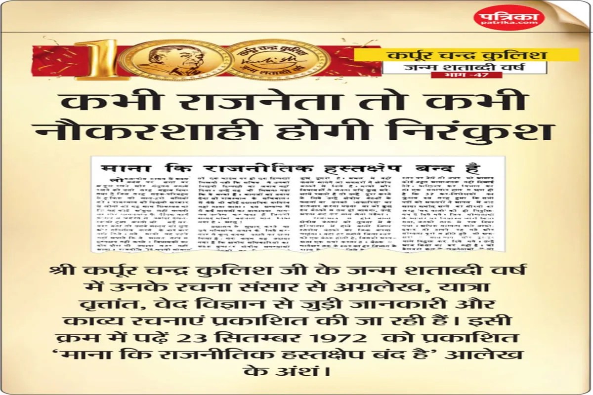 शासन में अफसरशाही के हावी होने की चर्चा कोई आज की नहीं है। सत्तर के दशक में जब लगातार एक ही राजनीतिक दल का शासन रहा तब भी राजस्थान में यह चर्चा रहती थी कि शासन तंत्र के दैनिक कामकाज में नौकरशाही हावी है। श्रद्धेय कुलिश जी ने ५४ बरस पहले आलेख में जो कुछ चिंता व्यक्त की वह आज भी सामयिक है। कुलिश जी ने तब भी सामंजस्य की आवश्यकता पर जोर देते हुए लिखा था कि ऐसा नहीं हुआ तो कभी नौकरशाही तो कभी राजनेता हावी होते रहेंगे। आलेख के प्रमुख अंश: लोकतंत्रीय शासन में कदम-कदम पर सत्ता पर अंकुश रखने और संतुलन बनाए रखने को उसी तरह से महत्व दिया गया है जिस तरह से सड़क परिवहन में ट्रेफिक की लाल-हरी बत्तियों को। राजस्थान की पिछली सरकार से यह आम शिकायत थी कि वह कोई अंकुश नहीं मानती थी और शासन तंत्र के दैनिक कार्यकलाप में जरूरत से ज्यादा दखलंदाजी हुआ करती थी। नई सरकार बनी तो उसने शासन को गतिशील करने के बार-बार दावे किए। नए मंत्री यह कहते नहीं अघाते कि वे शासन तंत्र में हस्तक्षेप नहीं करते। विधायकों का दौरा भी ज्यादा नजर नहीं आता। राजनीति में उन्होंने अपनी सीमाएं मान लीं और भरसक कोशिश कर रहे हैं उन सीमाओं में रहने की। जो लोग अतीव हस्तक्षेप की शिकायत करते थे, उन्हें यह जानकर खुश होना चाहिए।