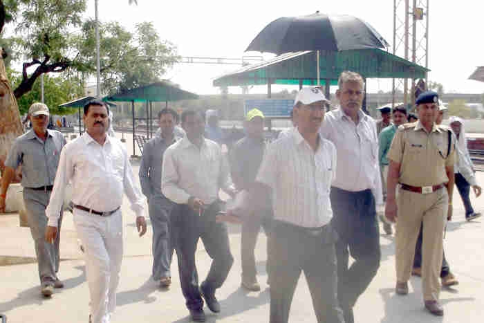 फोटो कैप्शन-एचसी-सीडी व सीई-हिण्डौनसिटी रेलवे स्टेशन पर निरीक्षण करते सीनियर डीएसटीई व सफाई करते कार्मिक।