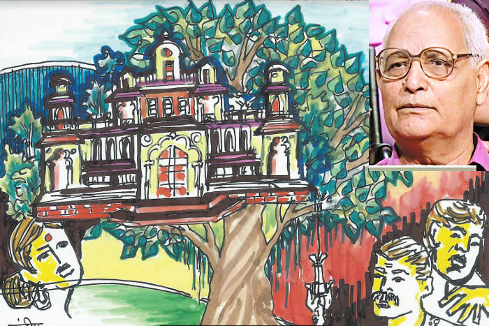 कोनों में सेठानियों के बड़े कमरे हैं जिनमें आज भी ब्रिटेन, जर्मनी में छपी रंगीन तसवीरें टंगी हैं। पीछे के चौथे छोटे चौक में रसोइयां और चौके हैं जहां आसन पाटे पर बैठ कर खाना खाया जाता था। उसके बाहर, पांचवे चौक में, गाय बैलों के ठाण और रथ भेली के ठांव बने हुए हैं। ठाणों में गायें तो नहीं रंभाती लेकिन पुराने रथ, ऊंट की जीन, उसके गले और पांव के घुंघरूं अब भी पड़े हैं। तीन मंजिली, 5 चौक की 101 साल की हवेली आज भी खड़ी है। 80 साल पहले, 1936 में इसी हवेली में मेरा जन्म हुआ था। विशाल बरगद का पेड़ हवेली की सभी गतिविधियों का साक्षी। मेरी बचपन की यादों का गवाह।