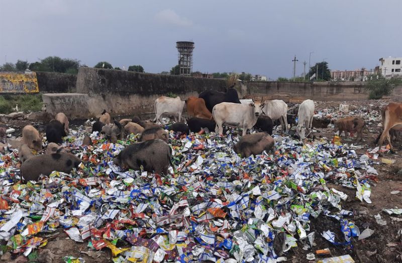 कचरे में से प्लास्टिक पैकेट खा रहे आवारा पशु