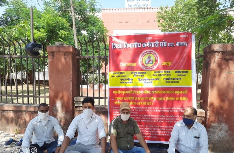 शिक्षा विभागीय कर्मचारी संघ ने कनिष्ठ सहायक की ग्रेड पे 3600 लेवल १० में किए जाने सहित विभिन्न मांगों को लेकर आज जिला कलेक्टर कार्यालय के बाहर धरना दिया। संघ के जयपुर जिलाध्यक्ष राजेंद्र मीणा ने कहा कि अपनी मांगों लेकर उन्होंने मुख्य सचिव को ज्ञापन दिया था साथ ही ७२ घंटे का नोटिस भी दिया था जो गत २५ सितंबर को ही समाप्त हो चुका है लेकिन अब तक मांगों को स्वीकार कर राज्य सरकार ने नियमों में संशोधन के आदेश जारी नहीं किए हैं जिससे मंत्रालयिक कर्मचारियों में आक्रोश है। उनका कहना था कि कोविड .19 के निर्देश पालना करते हुए धरने पर 5 पांच धरनार्थियों में उनके साथ संघ के महामंत्री राजाराम यादव, उपाध्यक्ष राजेन्द्र शर्मा, विधान चंद्र उपाध्याय ब्लॉक अध्यक्ष सी एल लाम्बा, हनुमान जाट, हनुमान सिंह सांकेतिक धरने पर रहे। मीणा का कहना था कि मंत्रालयिक कर्मचारियों के साथ किए गए वादों को पूरा करना सरकार का दायित्व है। वादों को पूरा करना सरकार का दायित्व है। संभागीय प्रवक्ता देवेन्द्र कुमार कुमावत का कहना है कि मंत्रालयिक कर्मचारियों की इन मांगों को शीघ्र मानकर सरकार द्वारा कर्मचारियों को राहत प्रदान की जानी चाहिए।