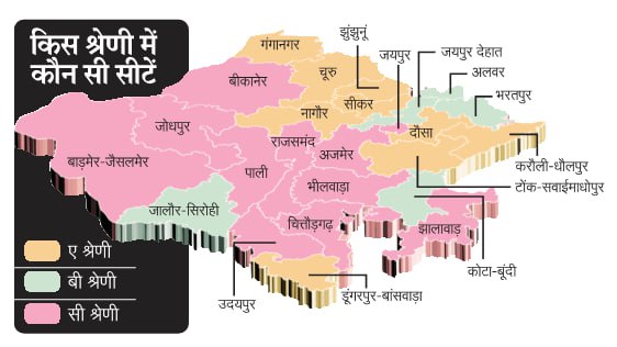 ए श्रेणी में डूंगरपुर-बांसवाड़ा, नागौर, सीकर, झुंझुनूं, चूरु, दौसा, टोंक-सवाईमाधोपुर, करौली-धौलपुर और गंगानगर हैं। बी श्रेणी में जयपुर देहात, कोटा-बूंदी, जालौर-सिरोही अलवर और भरतपुर है। सी श्रेणी में जयपुर शहर, पाली, राजसमंद, उदयपुर, अजमेर, चित्तौड़गढ़, भीलवाड़ा, बीकानेर, जोधपुर, झालावाड़ और बाड़मेर-जैसलमेर है।
