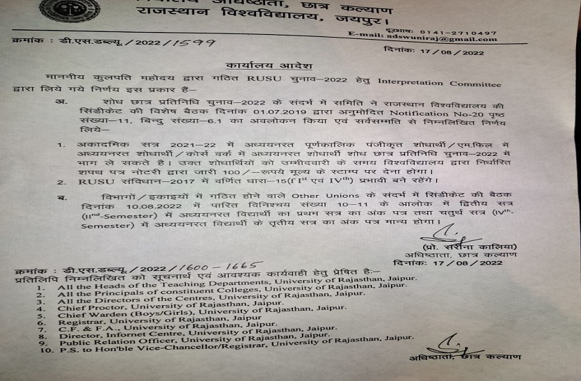 छात्र संघ चुनाव में शोध छात्र प्रतिनिधि के चुनाव नियमों में राजस्थान विश्वविद्यालय प्रशासन द्वारा देर रात बदलाव किया गया। डीएसडब्ल्यू सरीना कालिया ने आदेश जारी कर शैक्षणिक सत्र 2021-22 में अध्ययनरत पूर्णकालिक पंजीकृत शोधार्थी, एमफिल में अध्यनरत शोधार्थी, कोर्स वर्क में अध्ययनरत शोधार्थी शोध छात्र प्रतिनिधि की चुनाव में शामिल हो सकेंगे। जिसमें उम्मीदवारों को ₹100 के स्टांप पर शपथ पत्र पेश करना होगा।