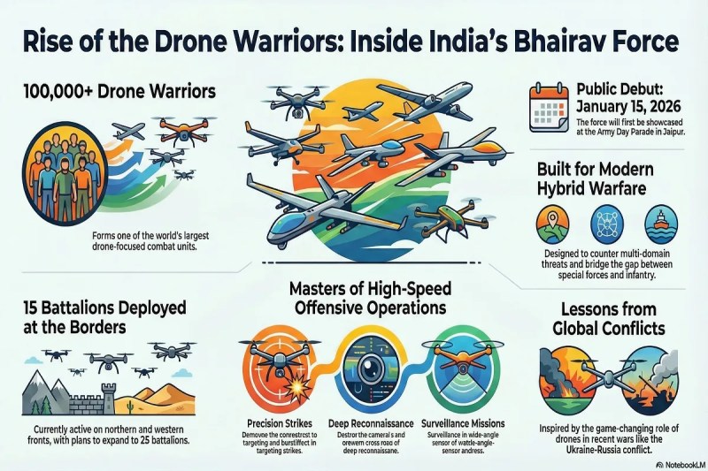 Indian Army Bhairav Force: जयपुर. भारतीय सेना ने आधुनिक युद्ध की चुनौतियों से निपटने के लिए बड़ा कदम उठाया है। जनवरी 2026 में सेना ने 'भैरव' नामक नई स्पेशल फोर्स बटालियनों का गठन किया, जिसमें एक लाख से अधिक प्रशिक्षित ड्रोन ऑपरेटर शामिल हैं। यह दुनिया की सबसे बड़ी ड्रोन-केंद्रित युद्ध इकाइयों में से एक है, जो हाइब्रिड और मल्टी-डोमेन थ्रेट्स का मुकाबला करने के लिए तैयार की गई है।