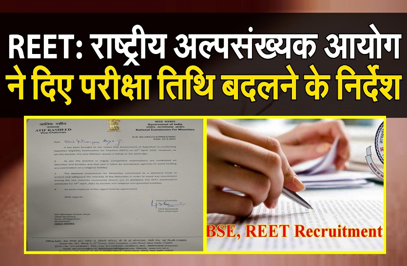 जयपुर। राजस्थान माध्यमिक शिक्षा बोर्ड (Rajasthan Board of Secondary Education) की ओर से महावीर जयंती यानी 25 अप्रैल को आयोजित की जाने वाली राजस्थान अध्यापक पात्रता परीक्षा रीट 2021 (reet) का मामला राष्ट्रीय अल्पसंख्यक आयोग (National Minorities Commission) तक पहुंच चुका है। आयोग के उपाध्यक्ष आतिफ रशीद ने राज्य सरकार को परीक्षा की डेट स्थगित करने के निर्देश दिए हैं। अब इस पर अंतिम फैसला सरकार को ही लेना है।