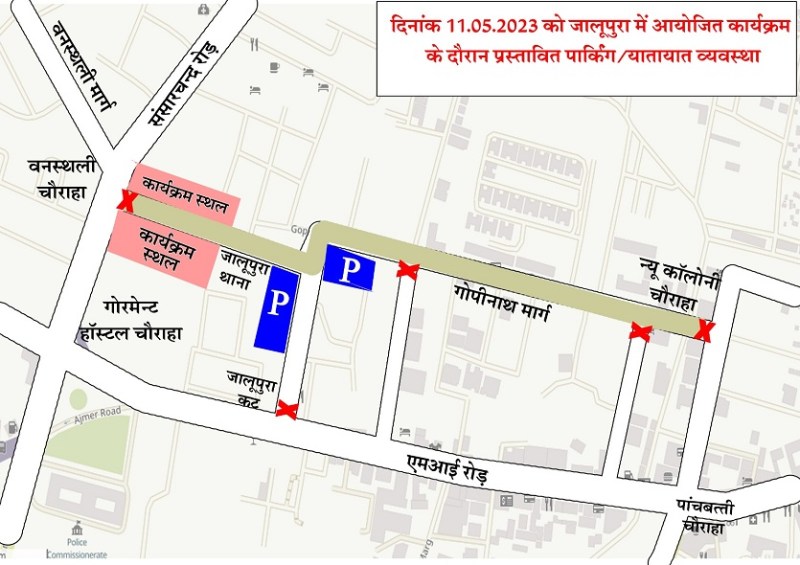 - कार्यक्रम के दौरान संसार चन्द्र रोड़ वनस्थली मार्ग चौराहा से जालूपुरा होकर न्यू कॉलोनी चौराहा के मध्य गोपीनाथ मार्ग पर चलने वाले यातायात को कार्यक्रम समाप्ति तक डायवर्ट कर समानान्तर मार्गो से संचालित किया जाएगा।