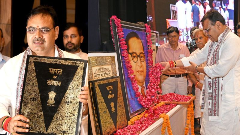 हम संविधान के प्रति संकल्पित, मुख्यमंत्री भजनलाल शर्मा मंगलवार को संगोष्ठी में शामिल होने से पहले आयोजन स्थल पर संविधान की प्रति हाथ में लेकर उसके प्रति संकल्प जाहिर करते हुए।