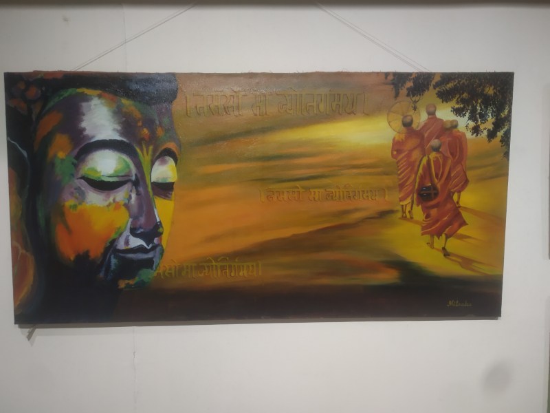 आर्टिस्ट रति जोशी ने बताया कि ये पेंटिंग भगवान शिव को डेडिकेट है। इसमें भरतनाट्यम करती महिला के साथ शिव स्तुति को बयां किया गया है। साथ ही पेंटिंग के इन मंत्रों से मिलने वाली पॉजिटिविटी का जिक्र भी किया है। आर्टिस्ट मिताली हर्षा ने बताया कि एग्जीबिशन में बुद्धा पर आधारित एक पेंटिंग डिस्प्ले की है। जो ‘तमसो मा ज्योतिर्गमय’ शब्दों से अंधकार से प्रकाश की ओर चलने का संदेश दे रही है।