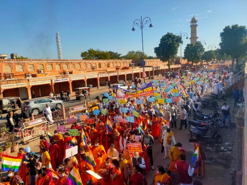 जयपुर. जैन धर्मावलंबियों से सबसे बड़े तीर्थ स्थल सम्मेद शिखर जी को पर्यटन स्थल घोषित करने के विरोध में आज सकल जैन समाज की ओर से मौन जुलूस निकाल कर विरोध प्रकट किया गया। सकल जैन समाज (दिगंबर और श्वेतांबर) के बैनर तले मौन जुलूस सांगानेरी गेट स्थित अग्रवाल कॉलेज से रवाना हुआ। मौन जुलूस जौहरी बाजार, बड़ी चौपड़, त्रिपोलिया बाजार, किशनपोल बाजार, अजमेरी गेट, एमआइ रोड़ , महावीर मार्ग होते हुए सी-स्कीम स्थित महावीर स्कूल पहुंचकर धर्मसभा में परिवर्तित हो गया। यहां दिगंबर और श्वेतांबर जैन संत और साध्वियों ने संबोधित किया। इसके बाद विरोध स्वरूप राष्ट्रपति, प्रधानमंत्री, राज्यपाल, मुख्यमंत्री, झारखंड सरकार के मुख्यमंत्री , सासंद आदि के नाम से उच्चाधिकारियों को ज्ञापन दिया गया।