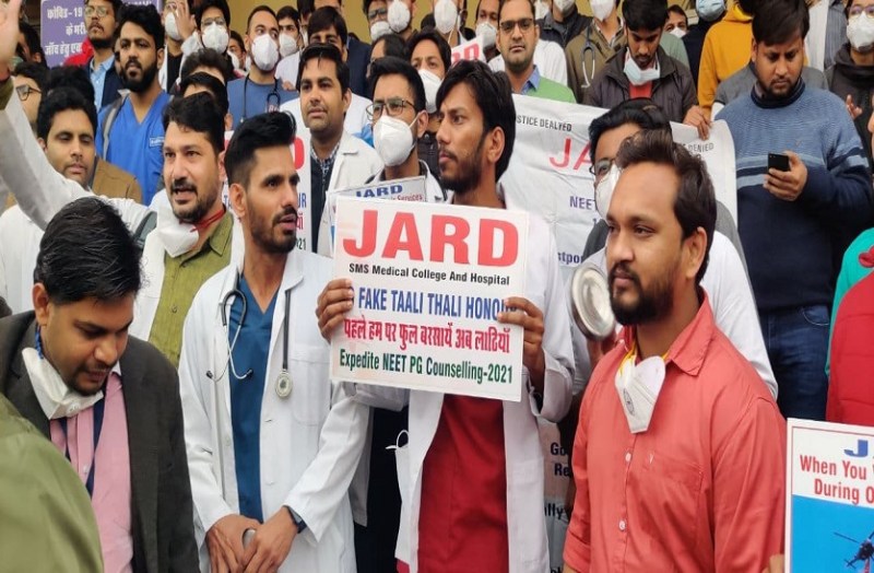 नीट पीजी काउंसलिंग जल्द करवाने के लिए दिल्ली में इन दिनों रेजिडेंट डॉक्टर्स का प्रदर्शन चल रहा है। कल इस प्रदर्शन पर पुलिस ने कार्रवाई की और रेजिडेंट को खदेड़ा। जार्ड के अध्यक्ष डॉ. अमित यादव का कहना है कि पुलिस ने फीमेल डॉक्टर्स के साथ अभद्र व्यवहार किया है। इसके लिए हम सरकार की ताली-थाली लौटा रहे हैं। आज शाम रेजिडेंट की जनरल बॉडी की मीटिंग की जाएगी। उसमें निर्णय किया जाएगा कि आगे भी कार्य बहिष्कार जारी रहेगा या नहीं। यदि केंद्र सरकार नीट पीजी काउंसलिंग पर जल्द कोई कार्रवाई नहीं करती है तो राज्य के रेजिडेंट भी एक बार फिर कार्य बहिष्कार पर उतरेंगे। इससे पहले 28 नवंबर से 11 दिन रेजिडेंट कार्य बहिष्कार पर रहे थे और मरीजों को बड़ी परेशानियों का सामना करना पड़ा था। वहीं रेजिडेंट ने आज कार्य बहिष्कार के दौरान दिल्ली पुलिस हाय-हाय के नारे भी लगाए।