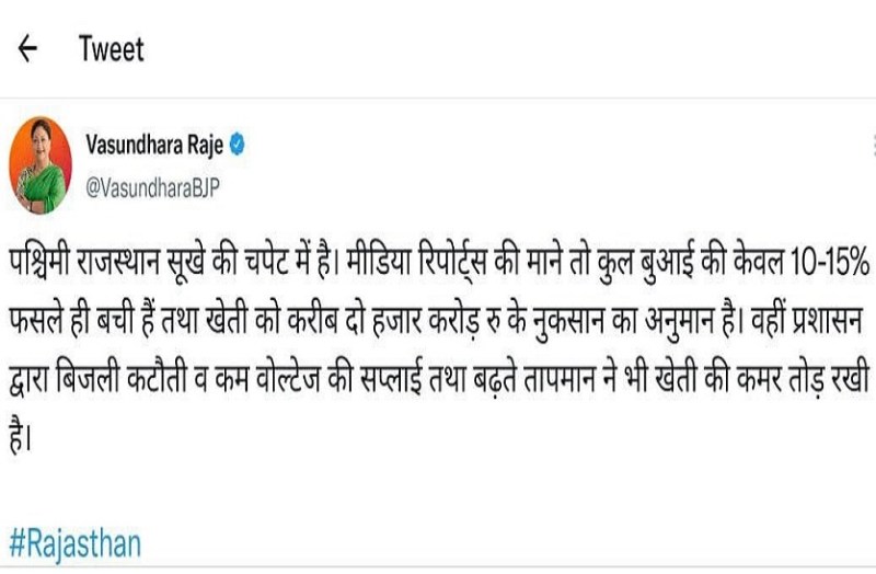 राजे ने सोशल मीडिया पर लिखा कि पश्चिमी राजस्थान सूखे की चपेट में है। मीडिया रिपोर्ट के अनुसार भी कुल बुवाई की केवल 10 से 15 प्रतिशत फसलें ही बची है और खेती को करीब 2000 करोड़ के नुकसान का अनुमान है। प्रशासन की ओर से बिजली कटौती और कम वोल्टेज की सप्लाई और बढ़ते तापमान ने भी किसानों की कमर तोड़ दी है, जिससे किसानों की भी चिंता बढ़ गई है। आपको बता दें कि पश्चिमी राजस्थान में मानसून की बेरुखी के कारण किसान परेशान हैं। किसानों की कई हेक्टेयर में फसलें खराब हो गई हैं। जोधपुर में किसानों को काफी नुकसान हुआ है। मगर प्रशासन की ओर से अभी तक कोई सहायता इन किसानों को नहीं मिल पाई है। इस वजह से राजे ने सोशल मीडिया के जरिए किसानों के दर्द को बयां किया है।