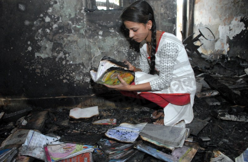 भारती ने सुबकते हुए पत्रिका संवाददाता से कहा कि अंकल मेरे संस्कृत, गणित, मोरल साइंस, सामान्य ज्ञान व कंप्यूटर के एक्जाम अभी बाकी है। 26 अप्रेल को एक्जाम समाप्त होंगे। बिना किताबों के मैं एक्जाम कैसे दूंगी। मैंने आज अपनी सहेली से भी किताब मांगी है, मैं उनके घर जाउंगी।
