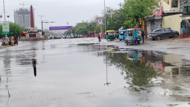 जयपुर शहर में बुधवार सुबह आई बारिश के त्रिमूर्ति सर्किल पर भरा पानी। फोटो-पत्रिका।