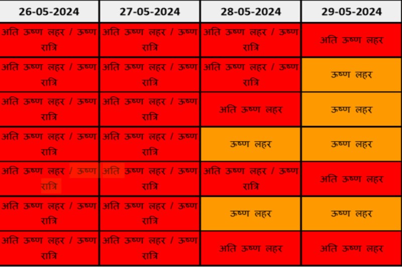 भारत मौसम विज्ञान विभाग (IMD) ने 26 मई के लिए अलवर, बारां, भरतपुर, बूंदी, दौसा, धौलपुर, जयपुर, झालावाड़, झुंझुनूं, करौली, कोटा, सवाई माधोपुर, सीकर, टोंक, बाड़मेर, बीकानेर, चूरू, हनुमानगढ़, जैसलमेर, जालोर, नागौर, पाली, श्रीगंगानगर और जोधपुर के लिए रेड अलर्ट जारी किया है। इन जिलों में उष्ण लहर से लेकर अति उष्ण लहर चल सकती है। वहीं अजमेर, भीलवाड़ा, चित्तौड़गढ़, प्रतापगढ़, राजसमंद के लिए ऑरेंज अलर्ट जारी किया है। इन जिलों में उष्ण लहर चलने की संभावना है। बांसवाड़ा, डूंगरपुर, सिरोही और उदयपुर के लिए गर्मी का येलो अर्लट जारी किया गया है।