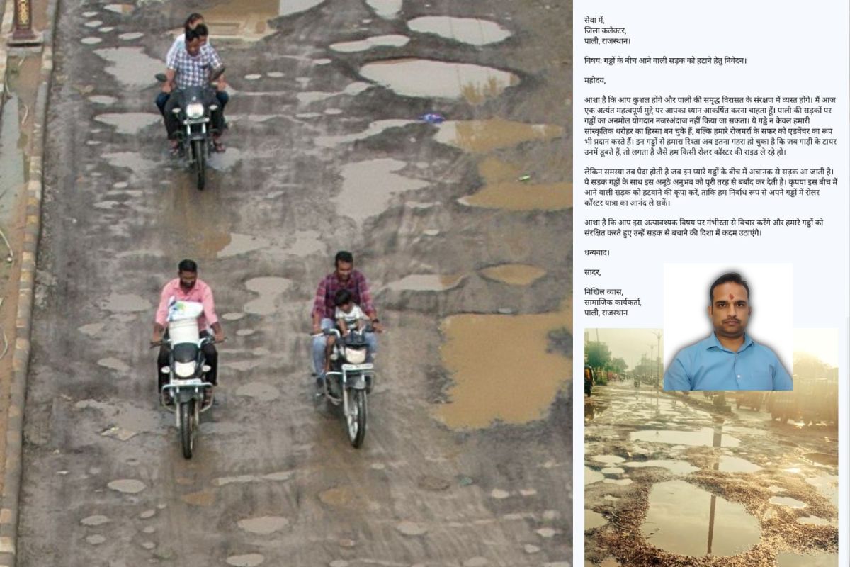 दरअसल यह मामला राजस्थान के पाली शहर का है। यहां की सड़क़ों की हालात इस कदर हो चुकी हैं कि लोग यह कहने लग गए हैं कि इसे सड़क कहकर सड़क की तौहीन मत करो। इस कारण पाली जिले के अधिवक्ता निखिल व्यास ने व्यंग्यात्मक लहजे में जिला कलक्टर को शहरवासियों की पीड़ा से अवगत कराया।